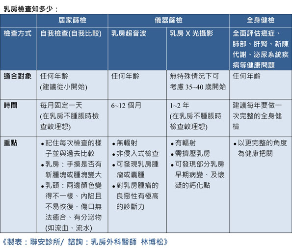 根據國民健康署統計,早期乳癌5年存活率超過9成,第一期乳癌更高達95%!可見乳癌早期篩檢有其絕大的意義。林博松醫師建議民眾每月應做乳房的自我檢查與平常比較,再定期搭配乳房超音波、乳房X光攝影的儀器檢查,協助發現自我檢查摸不到的異常。