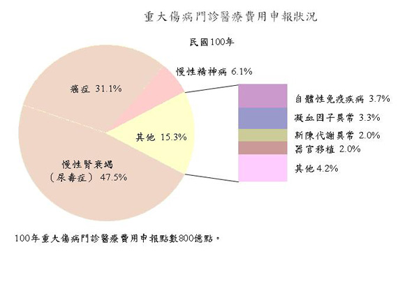 而在性別申報差異上,男性申報點數略高於女性,100年重大傷病門診醫療費用申報點數男性為403億點,較上年增加7.8%,女性397億點,較上年增加6.9%;兩性醫療費用申報皆以慢性腎衰竭(尿毒症)最多,分別佔45.5%及49.6%,其次為需積極或長期治療的癌症,分別佔31%及31.2%,在排名第三部分,男性以凝血因子異常居第三、佔6.5%,女性則是自體性免疫疾病居第三、佔6.2%。