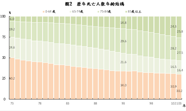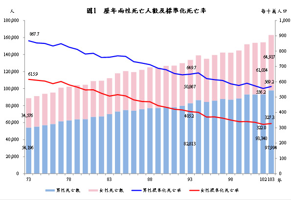 | 103年死亡人數計162,911人,較上年增加5.5%,較93年增加21.9%;男性97,994人,為女性64,917人的1.5倍。標準化死亡率為每十萬人口443.6人,較上年上升1.9%,較93年下降16.1%。