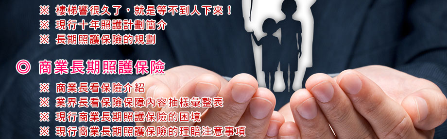 樓梯響很久了,就是等不到人下來!-長期照護保險 現行十年照護計劃簡介 【即將上線,敬請期待】-長期照護保險的規劃 商業長期照護保險 商業長看保險介紹 業界長看保險保障內容抽樣彙整表 【即將上線,敬請期待】-現行商業長期照護保險的困境 現行商業長期照護保險的理賠注意事項