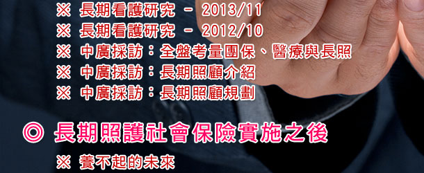 長期看護研究 - 2013/11 長期照護社會保險實施之後 養不起的未來 長期看護研究 - 2012/10 中廣採訪:全盤考量團保、醫療與長照 中廣採訪:長期照顧介紹 中廣採訪:長期照顧規劃